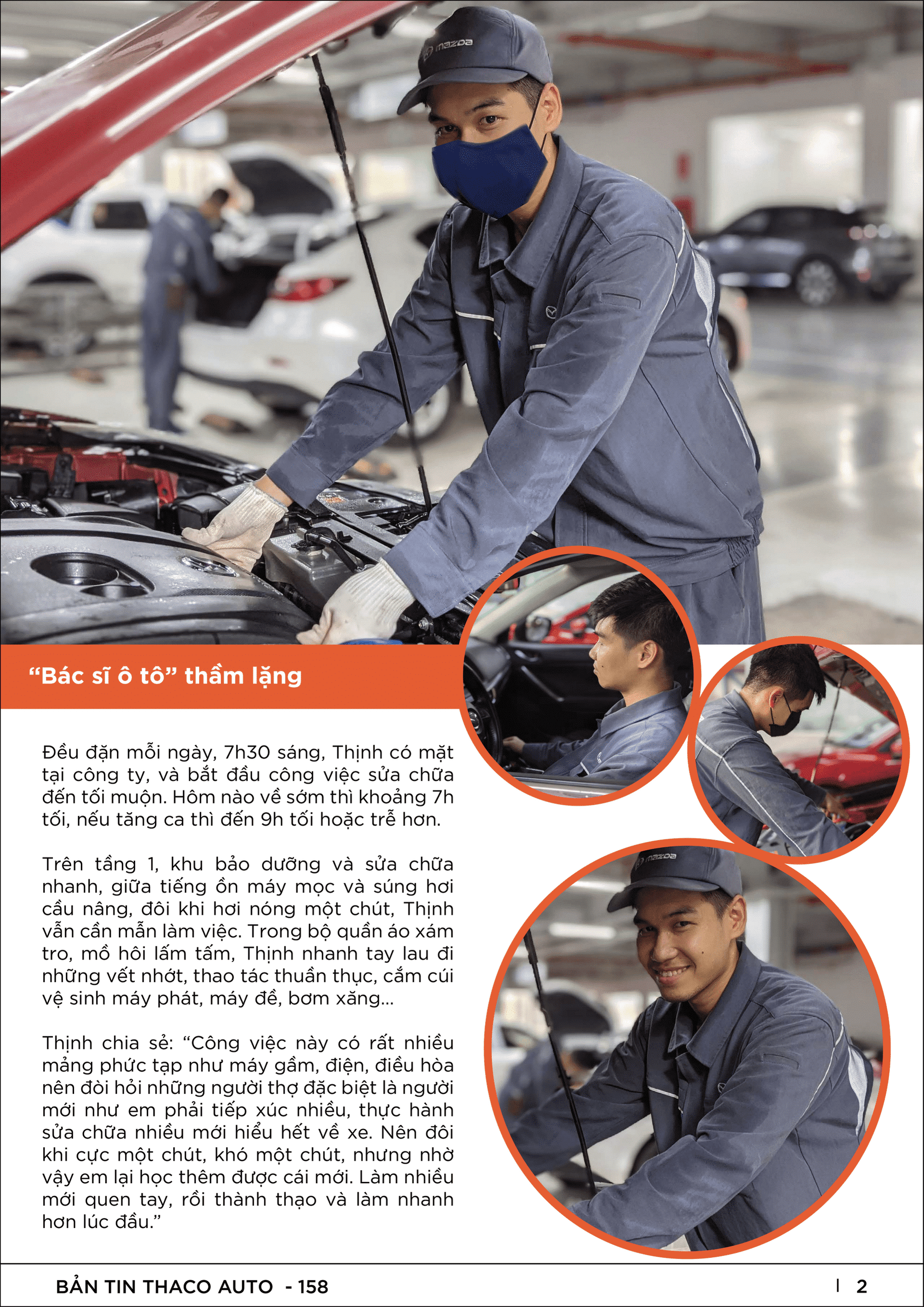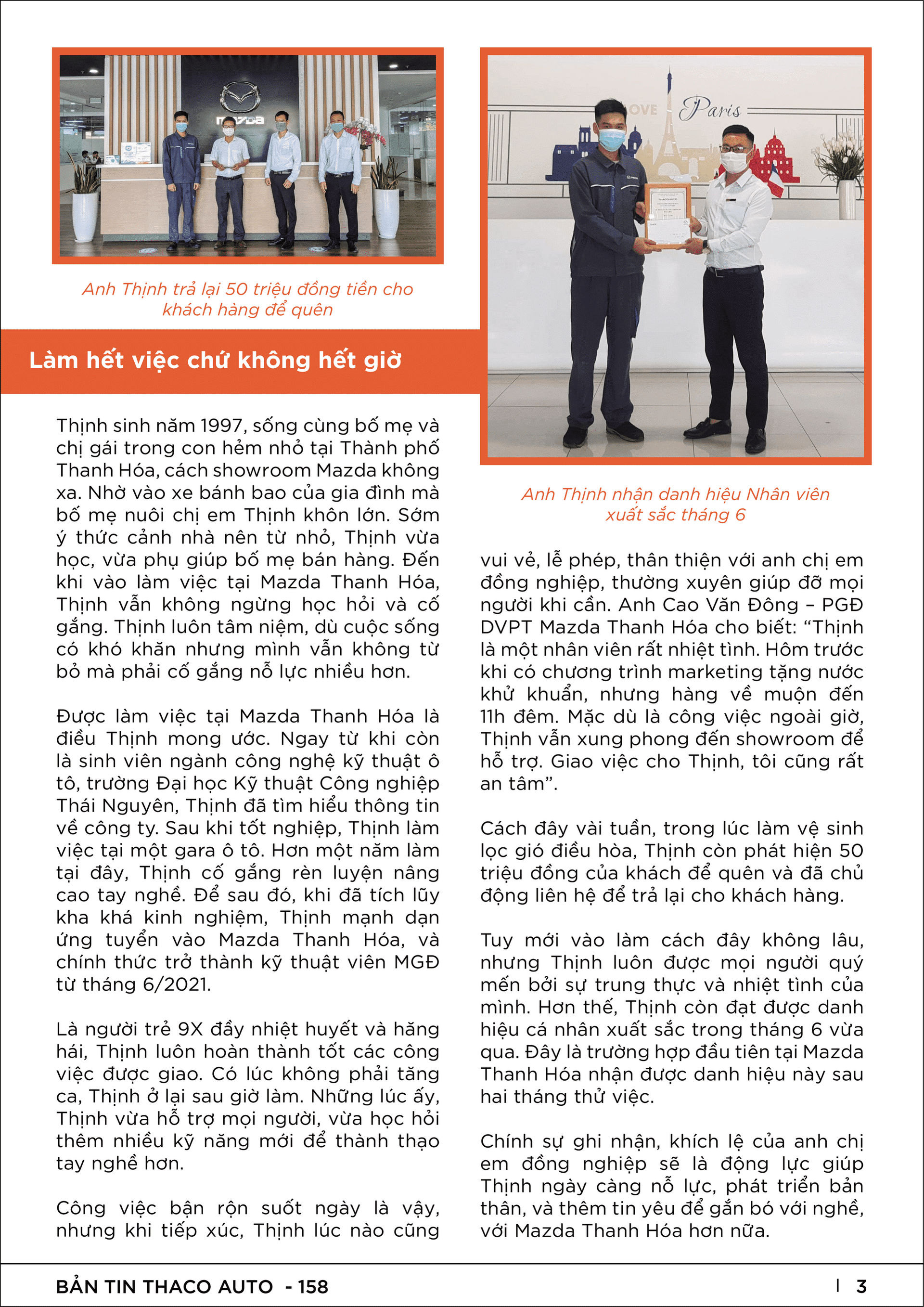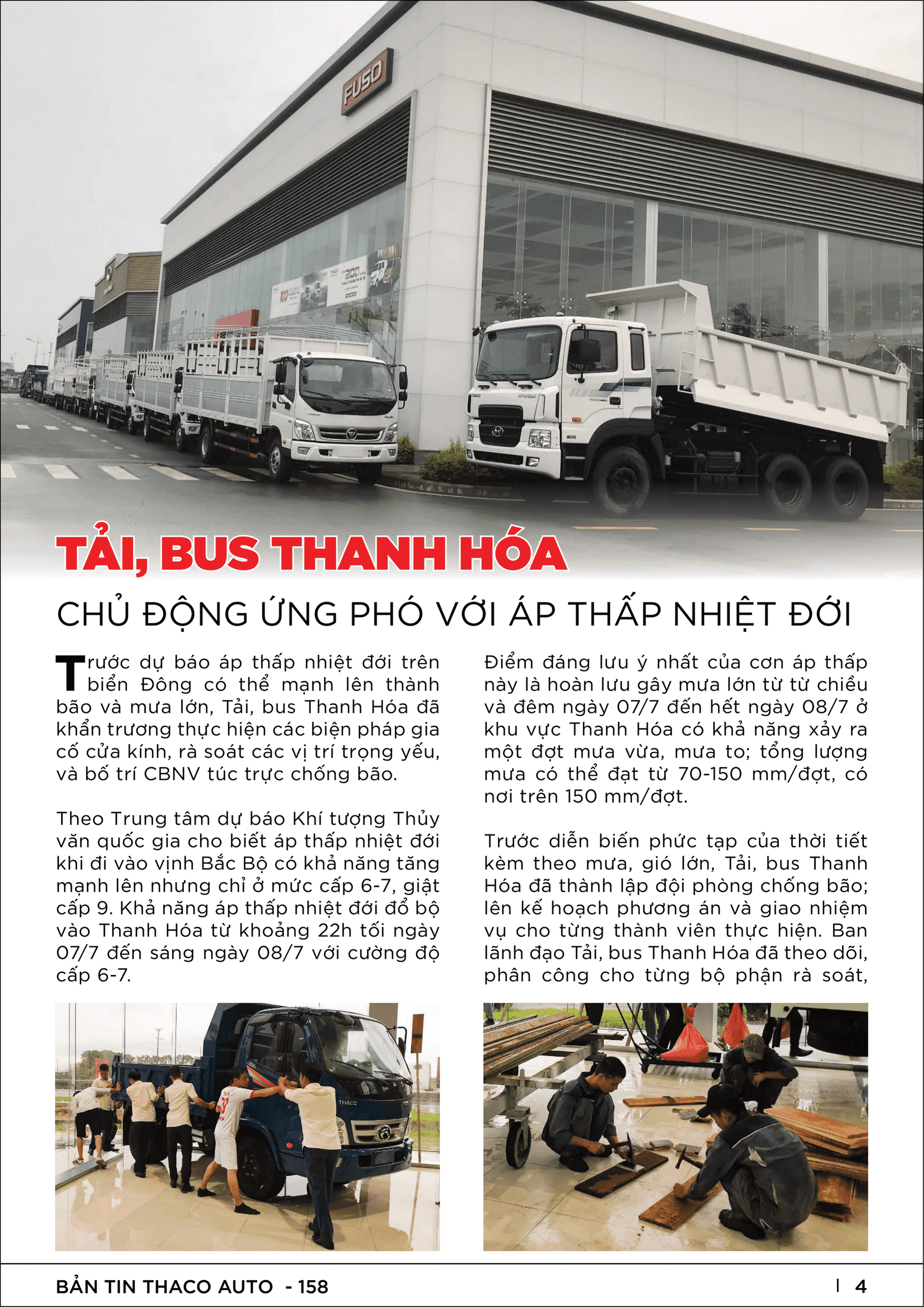 Kính gửi Ban Lãnh đạo, CBNV THACO AUTO ấn phẩm bản tin nội bộ số 158 với các nội dung nổi bật: KTV MGĐ Mazda Thanh Hóa: Làm hết việc chứ không hết giờ; Tải, bus Thanh Hóa chủ động ứng phó áp thấp nhiệt đới.