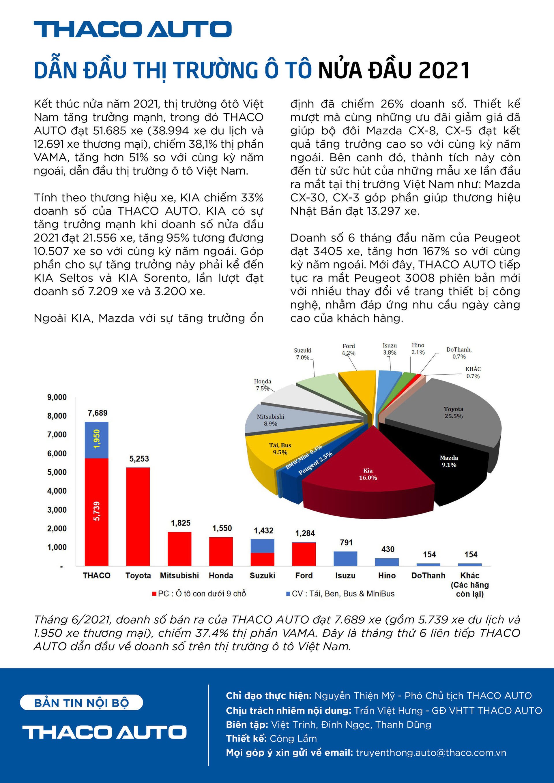 THACO AUTO ra mắt bản tin nội bộ số 160 với các nội dung: 63 xe chuyên dụng vận chuyển vaccine được bàn giao đến các quân khu; THACO AUTO dẫn đàu thị trường ô tô nửa năm 2021.