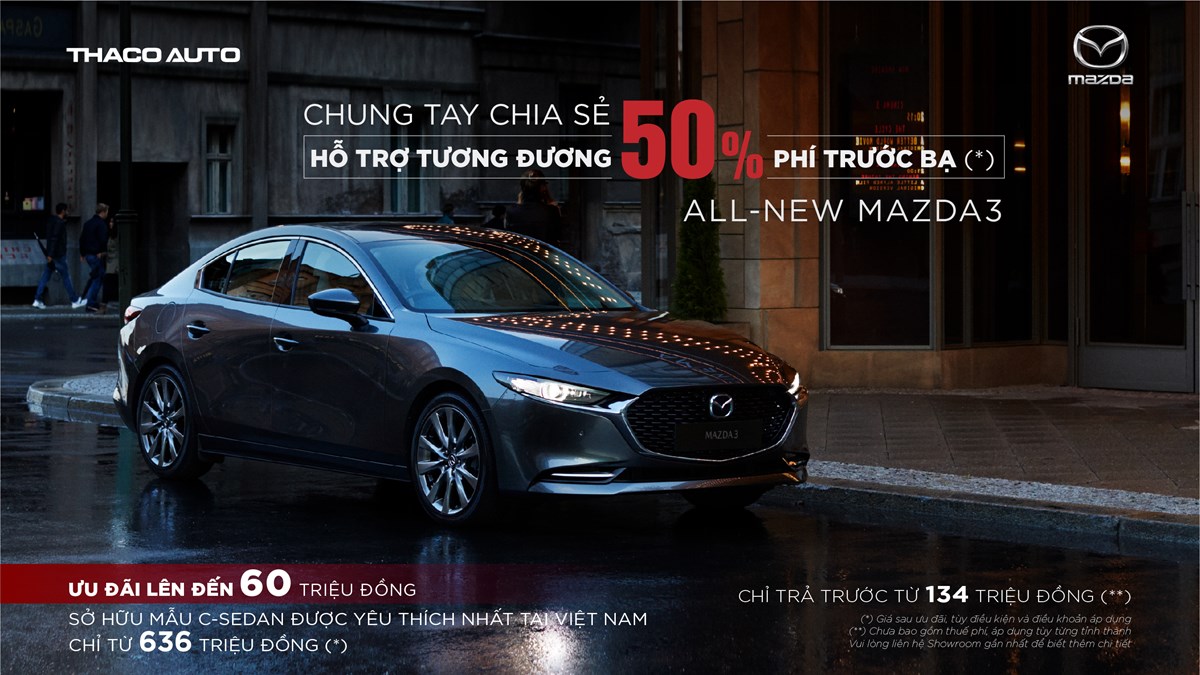 All-New Mazda3, mẫu xe đạt giải thưởng “Thiết kế đẹp nhất năm 2020” do hội đồng Giải thưởng ô tô thế giới (WCA) công bố cũng được Mazda Việt Nam hỗ trợ lên đến 60 triệu đồng, tạo điều kiện tốt cho khách hàng mong muốn sở hữu mẫu xe thế hệ thứ 7 đầu tiên tại Việt Nam với giá sau ưu đãi từ 636 triệu đồng. Ngoài ra, với ưu đãi vay mua xe đang được áp dụng, khách hàng chỉ cần trả trước từ 134 triệu đồng, có thể sở hữu ngay chiếc xe yêu thích.