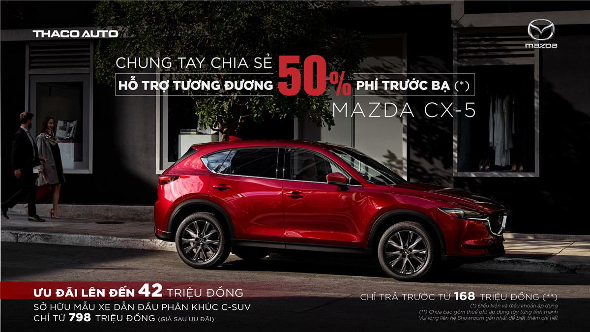 New Mazda CX-5, mẫu xe dẫn đầu phân khúc SUV tầm trung về doanh số đầu năm 2021 cũng đang được hỗ trợ tương đương 50% lệ phí trước bạ đối với phiên bản động cơ 2.0L, giá bán sau ưu đãi chỉ từ 798 triệu đồng. Đồng thời, với ưu đãi vay mua xe đang được áp dụng, khách hàng chỉ cần trả trước từ 168 triệu đồng.